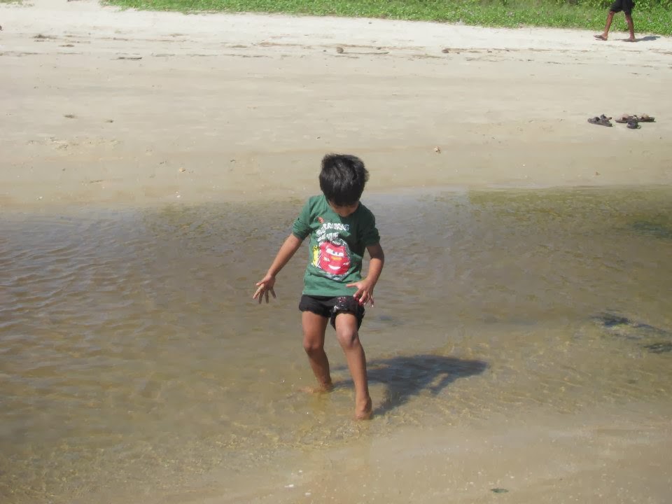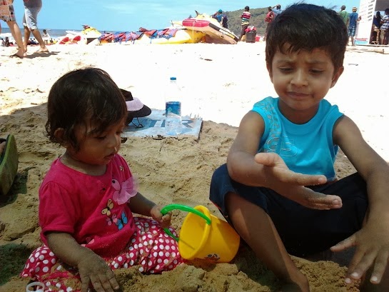 ये तो थी साहसिक जेट- स्की इसके बाद पेरासेलिंग का नंबर था , जब तक हम बड़े अपने कामों में व्यस्त थे तब तक हमारे तो छोटे पार्टनर कैसे बिजी थे देखिये, वो भी अपने लिए रेत के छोटे छोटे घर बना रहे थे-