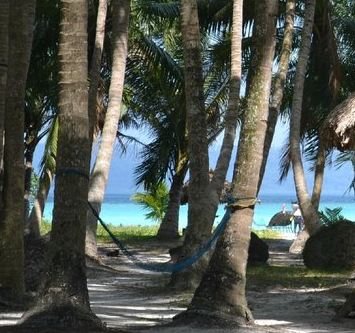 | नीले रंग का हैमक और पेड़ों के पीछे दिखता नीला समुद्र |