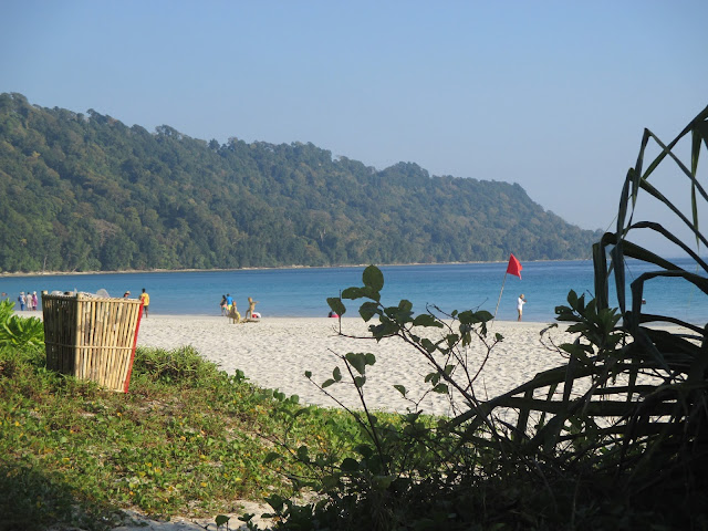 यहाँ पर समुद्री लहरे बहुत ऊँची ऊँची उठती है,सो लहरों के साथ तैरने के काफी अच्छी जगह है। पर शाम का समय होने के कारण और समुद्री लहरों के बढ़ते वेग तो देखते हुए कई सारे सुरक्षा गार्ड भी यहाँ घूम रहे थे। भीड़भाड़ से भरा होने के कारण यहाँ हर तरह के लोग दिखे। कुछ ऐसे थे जो पानी से बाहर आने का मोह नहीं छोड़ पा रहे थे तो कुछ अपने नए-नवेले जीवन साथी के साथ बैठकर रेत के घर बनाते हुए सुखद भविष्य के सपने देख रहे थे। कुछ पेड़ों की छावं में बैठकर लहरों का आना और जाना देख रहे थे। कई ऐसे थे जो बच्चों के साथ फुटबॉल खेल रहे थे और कुछ बैडमिंटन के मजे ले रहे थे। उम्र के हर पड़ाव के लोग यहाँ दिखे जो अपनी उम्र के हिसाब से ही अपना मनोरंजन कर कर रहे थे। हमारे बुजुर्ग साथियों का मन भी अपनी उम्र के अनुसार यंहा पर लगे शिव मंदिर के बोर्ड को देखकर वहां जाने को बैचेन हो गया तो हम भी उनके साथ हो लिए। जब तक दर्शन कर के वापस आये तब तक सूर्यास्त का समय हो गया। पर यहाँ शायद सूर्य देव हमसे कुछ रुष्ट थे और बादलों के पीछे जा के छुप गए,उन्होंने हमें अपने लाल नारंगी रंगों के दर्शन से वंचित कर दिया। सूर्यास्त होते ही हल्का हल्का अँधेरा होने लगा और बीच से बाहर निकलने तक पूरा अँधेरा हो ही गया। फ़ोन निकाल के निरंजन जी को बुलाने का सोचा तो पता लगा वोडाफ़ोन,बीएसनल दोनों नेटवर्क से बाहर। अब संपर्क का कोई साधन नहीं था। इधर उधर ,आगे पीछे घूम के खोजना चाहा तो भी कुछ पता नहीं लग पाया। इतना करते करते लगभग सब लोग ही चले गए। उतने में एक दुकान वाला बोला की आप मेरी दुकान के बहार बैठ जाओ, अंडमान बहुत सुरक्षित जगह है,यहाँ किसी का बाल भी बांका नहीं होता। सोचा उसी सज्जन के मोबाइल से फ़ोन कर के बुला लेते हैं तो पता लगा कि उनके पास फ़ोन नहीं है, फिर एक दो और दुकान वालों से बात कर के उन्होंने किसी के मोबाइल से फ़ोन करवाके निरंजन जी को बुला ही दिया और हम ख़ुशी खुशी सही सलामत होटल पहुँच गए। अब बड़ा प्रश्न ये था कि भोजन का क्या होगा,क्यूंकि एक तो हम शाकाहारी और उस पे एक आदमी के लिए सस्वास्थ को देखते हुए रोटी खाना जरूरी ,तो एक बार फिर नालाज किंगडम से हमने निरंजन जी को भेज के खाना मंगवाया। उसके बाद पता लगा की होटल वाले भी आर्डर देने पर रोटी बना देते। चलिए कोई नहीं खाने से मतलब कहीं से भी मिले।